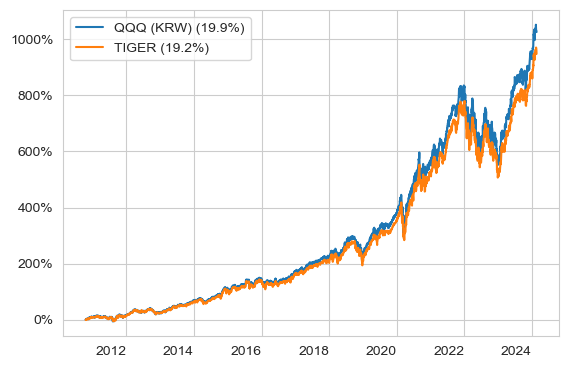 아래는 원화로 환산한 QQQ와 TIGER 미국나스닥100의 지난 성과입니다. SPY의 경우와 유사하게, 대략 연 0.7%의 수익률 차이가 납니다. 변동성은 거의 동일합니다.