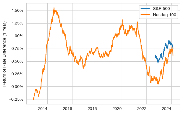 국내 ETF와 미국 ETF의 수익률 차이가 일시적인 것인지, 아니면 지속적으로 발생하는 것인지 살펴봅니다. 아래는 1년 (250거래일 가정) 수익률 차이를 1년 이동 평균으로 나타낸 것입니다.