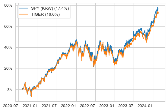 아래는 원화로 환산한 SPY와 TIGER 미국S&P500의 지난 성과입니다. 대략 연 0.8% 수익률 차이가 납니다. 변동성은 거의 동일합니다.