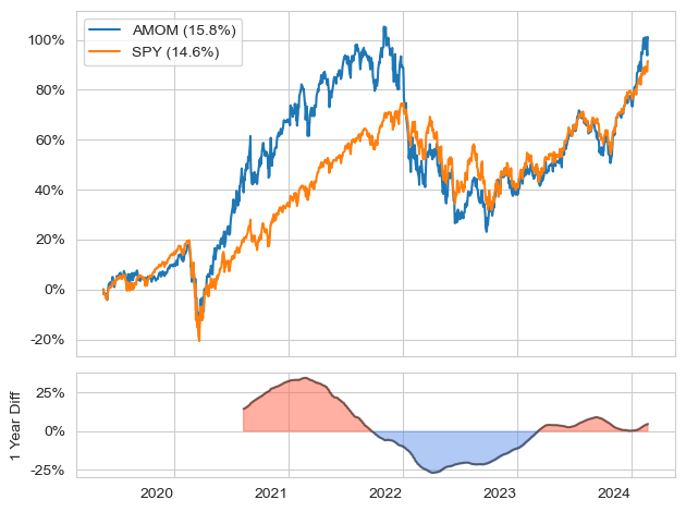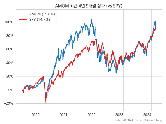 AMOM 역시 QRAFT사의 ETF입니다. 이 상품은 추세 즉 모멘텀을 이용하는 ETF입니다. SPY에 비해 CAGR은 1.0% 높았지만, 한눈에 보기에도 상당한 변동성이 눈에 보입니다.