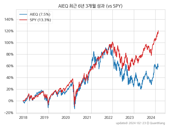 AIEQ는 비교 분석한 ETF 중에서 상장 기간이 가장 깁니다. AIEQ는 재무제표뿐 아니라 기술적 분석을 포함하여 뉴스나 SNS 데이터도 참고한다고 합니다.