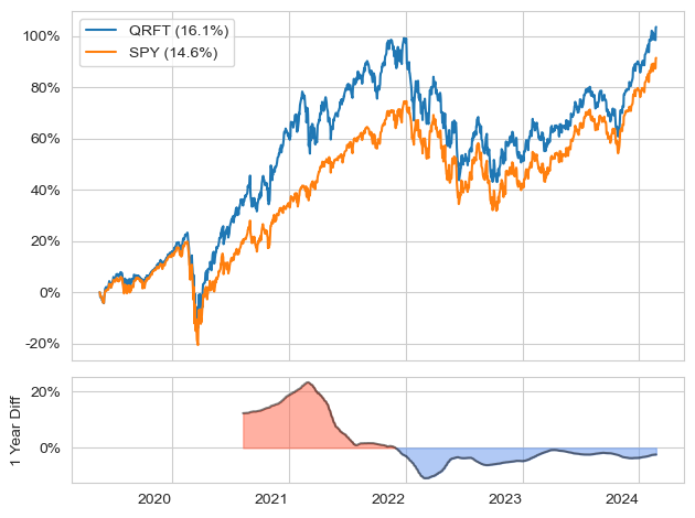 QRFT와 SPY와 1년 수익률 차이를 보면, 2021년 중반 이후로 SPY에 비해 지속적으로 성과가 미흡했음을 알 수 있습니다.