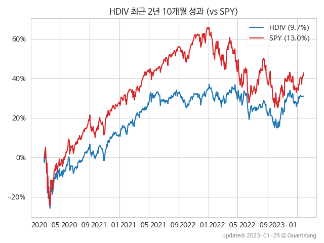 HDIV의 변동성은 SPY 대비 낮은 편이라, 이를 고려하면 SPY에 크게 떨어지지 않았던 ETF입니다.