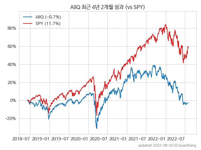 AIIQ 인공지능 기술을 사용하여 전 세계 주식을 대상으로 종목을 선별하여 투자하는 ETF입니다. SPY에 비해 연 -12.4% 낮은 수익률을 보였습니다. 이 때문인지 2022년 7월 29일을 상장폐지되었습니다.