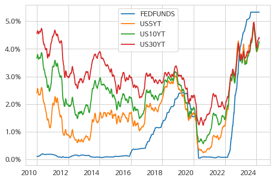 아래는 미국의 기준금리(FEDFUNDS), 5년 국채(US5YT), 10년 국채(US10YT), 30년 국채(US30YT) 수익률의 20일 이동평균입니다.