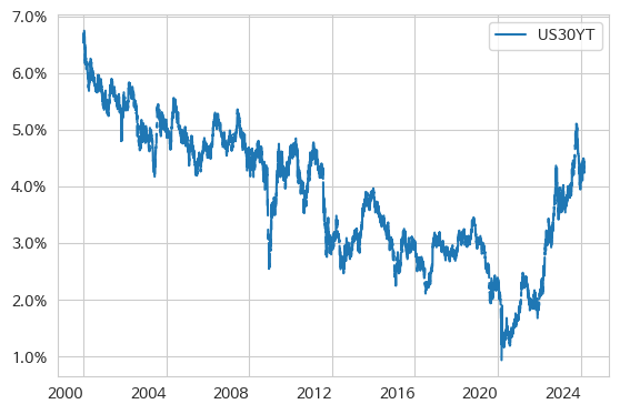 아래는 미국 장기 국채 30년물의 수익률 추이입니다. 미국 정부는 매일 채권을 발행하지 않습니다. 기준금리가 1년에 8번 결정되듯이, 1달 한번 정도 국채 입찰이 있습니다. 다음번 입찰 때까지 채권의 가격이 계속 변합니다. 이를 고려한 국채 금리가 국채 수익률입니다.