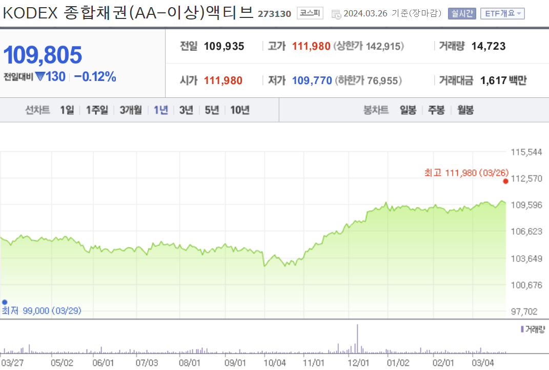 아래는 네이버 증권에서 살펴본 KODEX 종합채권(AA-이상)액티브의 지난 1년간의 주가 흐름입니다.