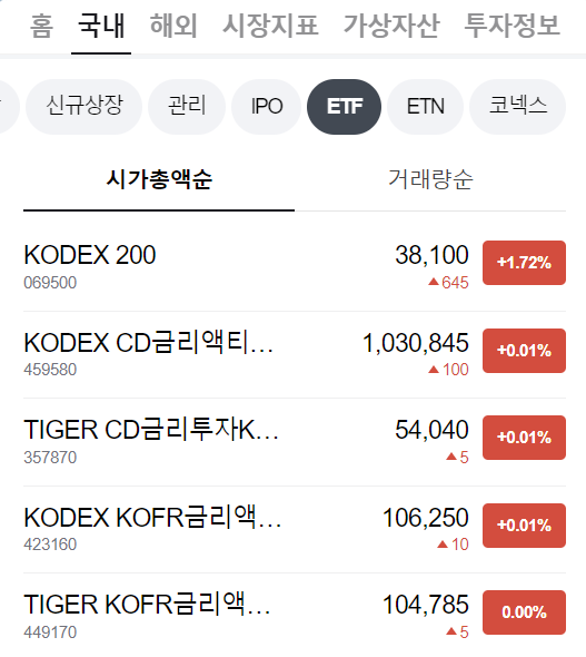 몇 년 전부터 단기 채권 금리 수준의 이자를 지급하는 채권 ETF가 인기를 끌고 있습니다. 네이버 파이낸스의 ETF 페이지를 보면, 시가총액 상위 5개 ETF 중에 단기 채권 ETF가 4개나 포함되어 있습니다. 아래 그림에서 KODEX 200을 제외한 나머지 4개는 단기 채권 ETF입니다.