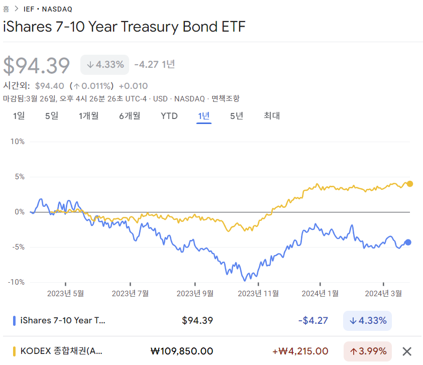 아래는 미국 중기 국채 ETF인 IEF와 KODEX 종합채권(AA-이상)액티브의 지난 1년 주가 흐름입니다. IEF는 듀레이션이 7.3년으로 KODEX 종합채권(AA-이상)액티브의 5.9년과 비슷합니다.
