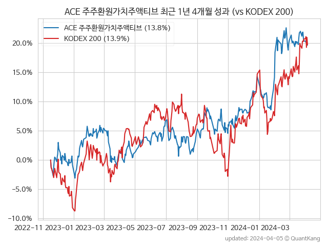 주의: 이 글은 특정 상품에 대한 추천의 의도가 없습니다. 이 글에서 제시하는 수치는 과거에 그랬다는 의미이지, 앞으로도 그럴 거라는 예상이 아닙니다. 분석 기간이나 분석 방법에 따라 전혀 다른 결과가 나올 수 있습니다. ACE 주주환원가치주액티브는 상장된 지 오래되지 않았습니다. 글에서 제시하는 수익률을 포함한 각종 지표에 대한 신뢰성은 그다지 높지 않습니다.