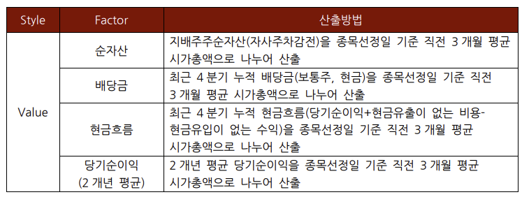 4가지 팩터는 주가순자산비율(PBR; Price to Book-value Ratio)이 낮고, 배당률이 높으며, 현금흐름이 양호하고, 최근 2년 주가수익비율(PER; Price Earning Ratio)이 낮은 종목을 우선시합니다.