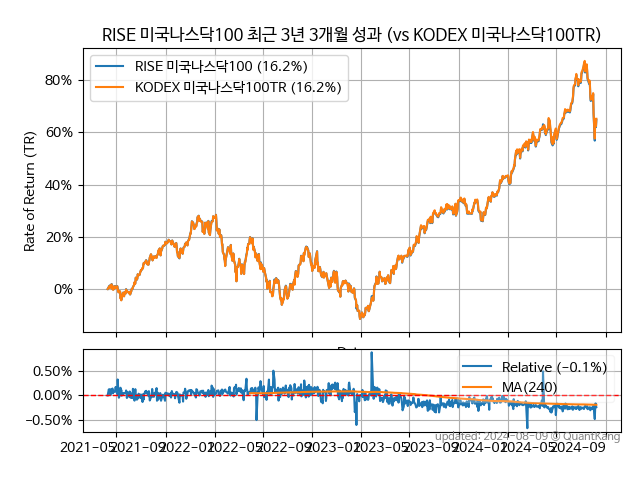 아래는 TIGER와 KODEX의 주가를 비교한 그래프입니다. 배당 재투자를 가정하였습니다. 데이터 출처: TIGER 미국나스닥100 (133690) vs KODEX 미국나스닥100TR (379810)