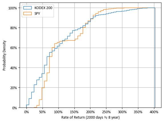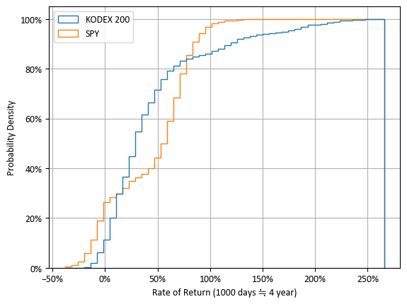 오른쪽 그래프를 보면 원금 손실이 발생한 확률을 알 수 있습니다. x = 0%를 기준으로 보면, KODEX 200의 원금 손실 확률은 대략 10% 정도였고, SPY는 20% 정도였습니다. 발생 확률은 낮았지만, KODEX 200의 가장 낮은 수익률은 -17%였고, SPY는 -38%였습니다.