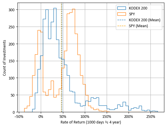 두 자산의 전 기간 거치식 수익률은 비슷했습니다. 우위를 가리기 어렵습니다. 아래는 4년간(1,000거래일) 거치식으로 투자한 백테스트 결과에서 최종 수익률의 분포를 정리한 그래프입니다.