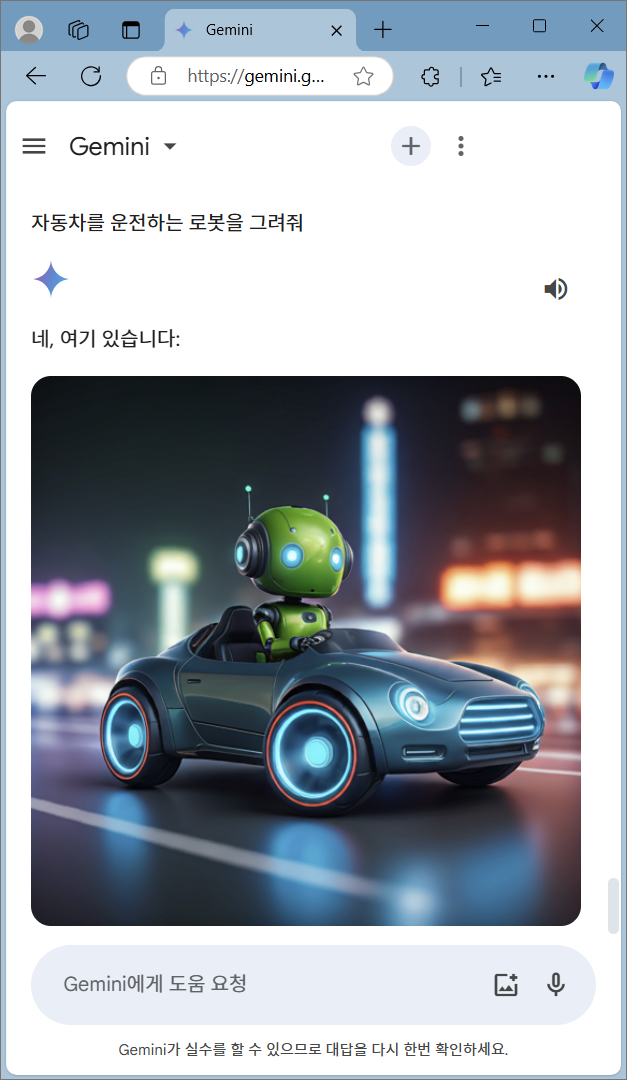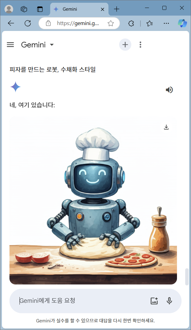 구글 제미나이(https://gemini.google.com/)에 접속해서 적절한 프람프트(prompt)를 입력하면 그림을 그려줍니다. 사람은 그릴 수 없지만, 동물이나 로봇으로 설명하는 프람프트는 만들 수 있습니다.