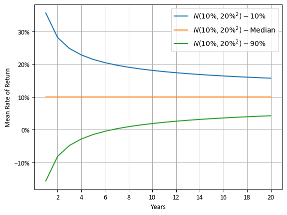 아래는 1년 수익률을 N(10%, 20%²)으로 모델링한 어떤 자산의 최대 20년간 투자 수익률의 분포입니다. 수익률 분포는 간결하게 10%, 50%(중앙값), 90% 분위수로 표시했습니다. 1년 평균 수익률은 10%이며, 1년 수익률의 표준 편차는 20%입니다. 출처: 투자 성과 분석의 초급 - 7. 정규 분포에서 표준 편차가 변하면 장기 투자에 어떤 현상이 발생할까?