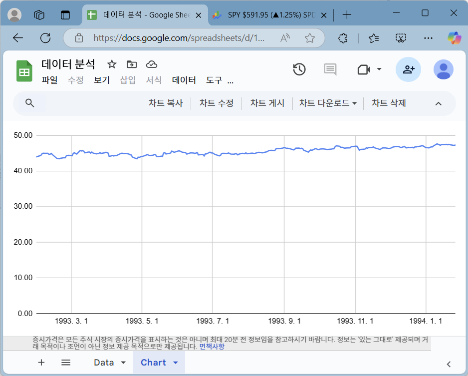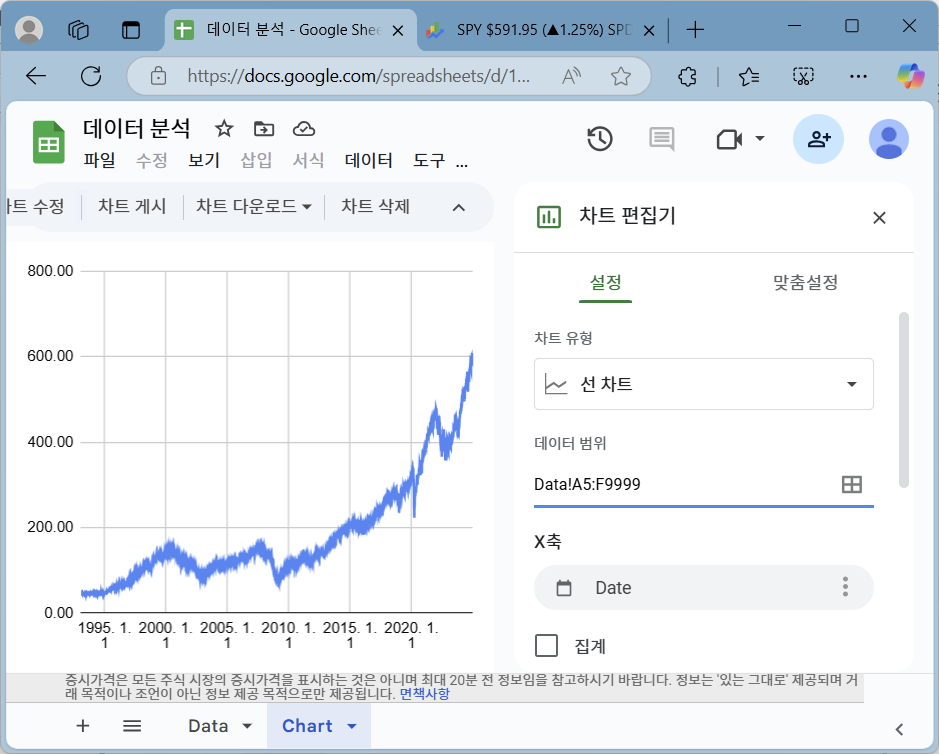 종가(Close)를 기준으로 그래프를 그리면, 다음과 같이 SPY 주가 흐름 그래프를 얻을 수 있습니다. 시트의 탭 이름은 데이터를 가지고 있는 Data와 그래프를 표시한 Chart로 나누었습니다.