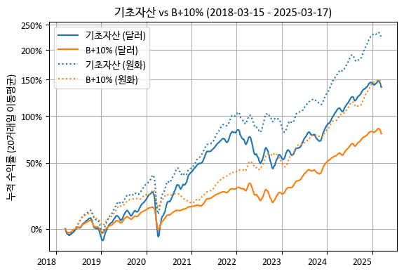 파란색 선은 환헤지인 기초자산(달러)과 B+10%(달러)에 분산 투자한 경우이고, 초록색 선은 환노출인 기초자산(원화)과 B+10%(원화)에 분산 투자한 경우입니다.