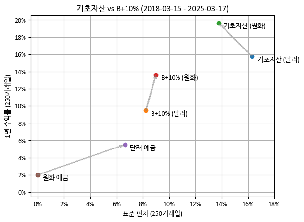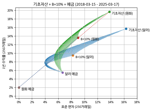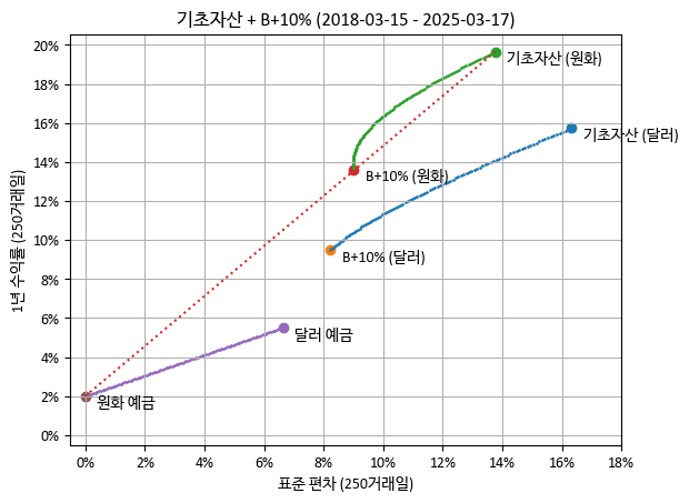 다음 그림은 기초자산과 B+10%의 1년 평균 수익률과 표준 편차를 평균-분산 그래프에 나타낸 것입니다. 기초자산(달러)은 달러화 기준으로 환헤지에 해당되고, 기초자산(원화)은 원화 기준으로 환노출에 해당됩니다. 원화 예금은 이름 그대로 원화 예금(또는 RP, 발행어음, 단기채권 ETF)이고, 달러 예금은 달러로 환전한 후 외화 예금(또는 RP, 발행어음, 단기채권 ETF)에 둔 경우라 볼 수 있습니다.