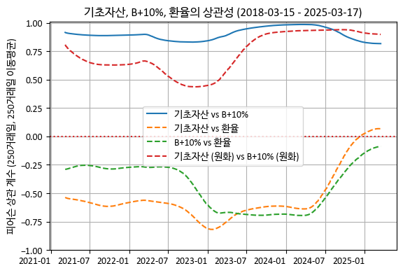 기초자산(달러), B+10%(달러), 환율의 상관성은 다음 그래프와 같습니다. 1년 수익률 1년치에 대한 피어슨 상관계수의 1년 이동평균입니다.