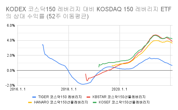 개인적으로 레버리지 ETF를 좋아하기에 KOSPI 200 레버리지 지수를 추종하는 ETF와 더불어 KOSDAQ 150 레버리지 지수를 추종하는 ETF도 포트폴리오에 담고 있습니다. 국내에는 총 5종의 KOSDAQ 150 레버리지 지수 추종 ETF가 있으며, 거래금액으로는 KODEX가 타 ETF에 비해 압도적으로 많습니다. KODEX는 타 ETF에 비해 총보수가 높은 편입니다. (현재 0.64%) 아래 그래프는 KODEX를 제외한 나머지 ETF의 KODEX 대비 상대 수익률입니다.