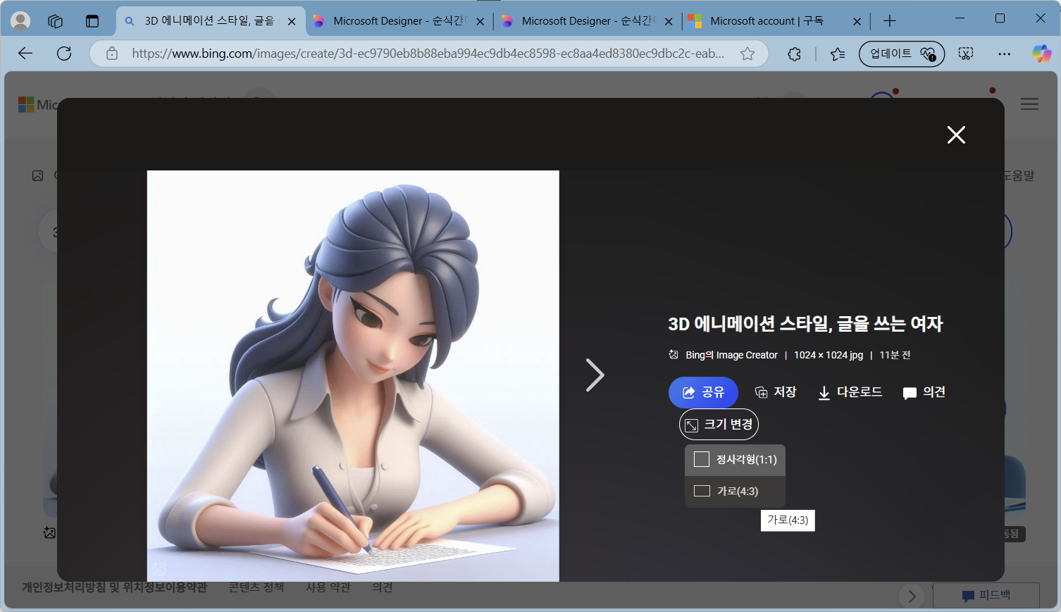 세로 모드는 어쩔 수 없지만, 가로 모드 그림은 무료인 이미지 크리에이터를 이용할 수 있습니다. 다음 그림과 같이 이미지 크리에이터로 만든 그림을 하나 선택하면, 마지막에 크기 변경 버튼이 있습니다. 가로(4:3)를 클릭하면 주어진 프롬프트로 가로 모드 그림을 그려줍니다.