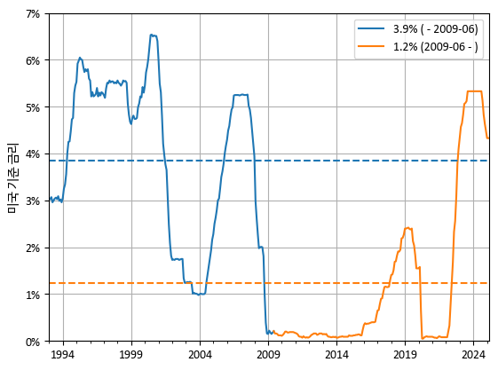 2009년 6월까지 평균 기준 금리는 3.9%였습니다. 2009년 6월부터 2025년 4월까지의 평균 기준 금리는 1.2%였습니다. 이전 글에서 설명했다시피, 레버리지는 스왑(swap) 계약으로 레버리지를 구현합니다. 일종의 현물 대출입니다. 자연히 이자가 나가고, 그 이자는 기준 금리와 같은 단기 금리에 영향을 받습니다.