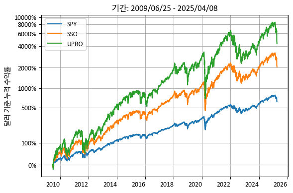 다음 왼쪽 그림은 S&P 500 지수의 일일 수익률을 1배, 2배, 3배로 추종하는 SPY, SSO, UPRO ETF의 누적 수익률 그래프입니다. 가장 최근에 상장된 UPRO의 상장 기간을 기준으로 삼았습니다.