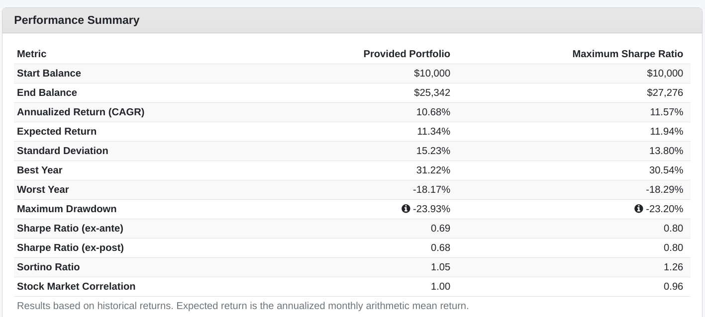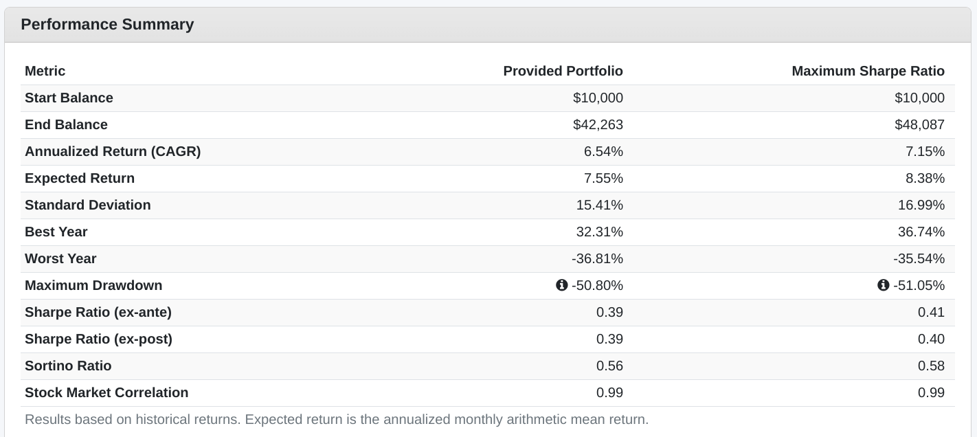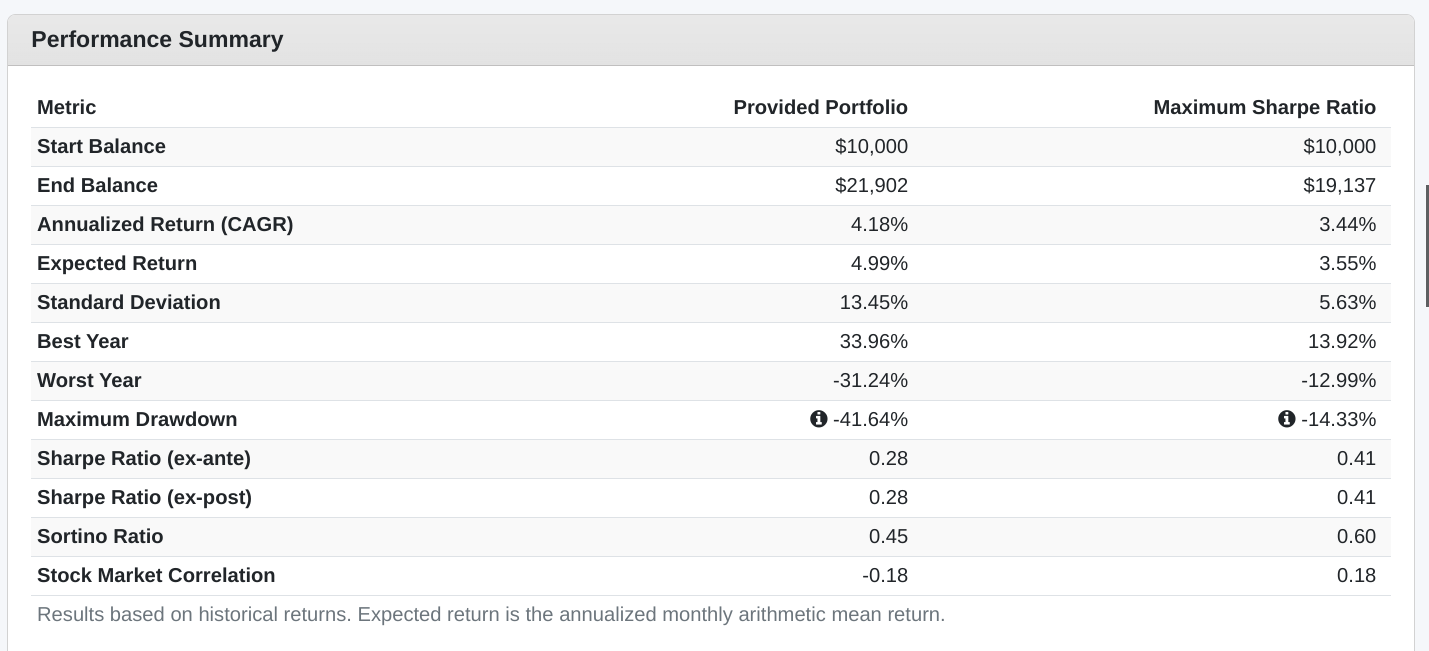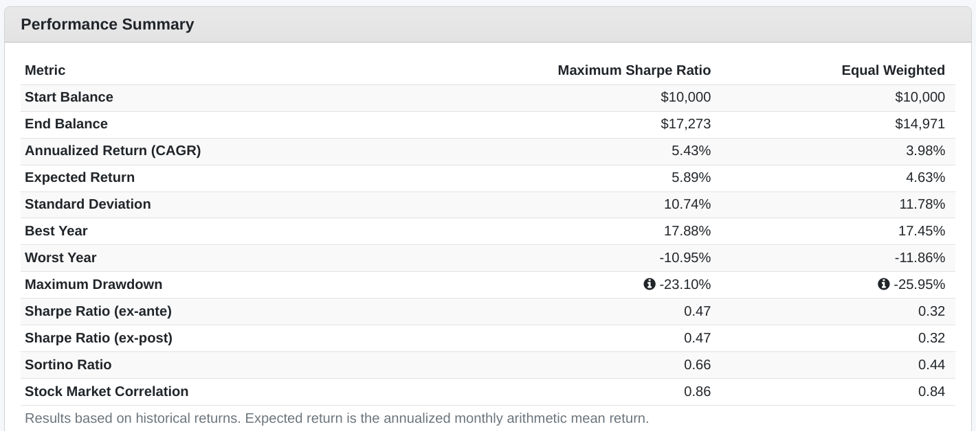 위의 글에서도 여러 번 강조해서 설명드렸다시피 최적화로 도출된 포트폴리오는 과거 데이터로 봤을 때 유용했다는 의미이지, 앞으로 해당 포트폴리오의 성과가 좋을 것이라는 예상이 아닙니다. 그러니 최적화로 도출된 포트폴리오의 자산 구성은 질문에 대한 정답이 아니라 해답을 찾아가는데 필요한 힌트로 삼는 것이 바람직합니다.