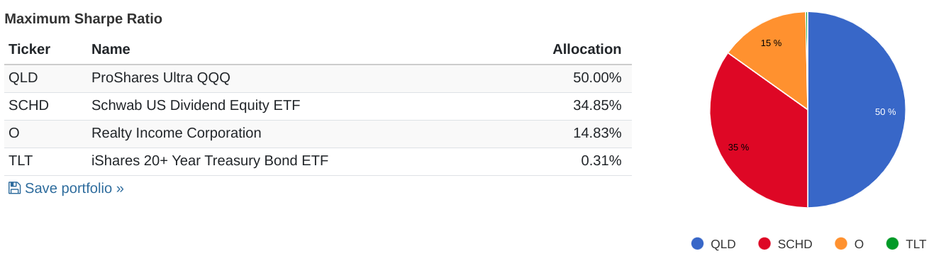 QLD에 50%를 투자했다면, 나머지는 2 : 1 정도로 SCHD와 O에 투자했던 결과가 투자 수익률을 고려했을 때 괜찮았다. 하지만 투자 수익률이 높아지면서 변동성도 함께 증가했기에 위험 대비 수익률 즉 투자 효율은 개선되지 않았다.