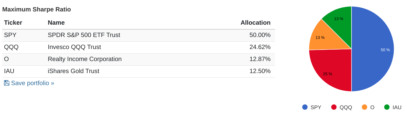 50%는 SPY에 투자하고, 나머지는 QQQ : O : IAU에 2 : 1 : 1로 투자한 결과가 괜찮았다. SPY 100%와 비슷한 수준의 위험도였지만 연 수익률은 0.9%가량 높았다.