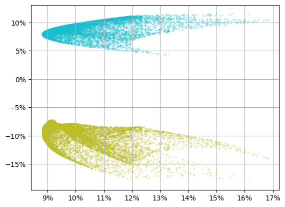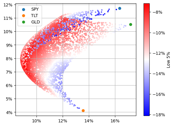 이 글에서는 하위 5%(상위 95%) 순위 수익률을 평균-분산 그래프에 나타내고, 특정 조건을 만족하는 포트폴리오의 자산 비중도 살펴보는 방법을 소개합니다.
