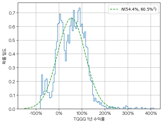 간단하게 말하면, TQQQ 1년 수익률 분포를 정규 분포로 모델링하여 분석하면, 1년 투자했을 때 전액 손실이 발생할 수 있으니, 복리로 투자하지 말라는 결론이 나올 수 있습니다.
