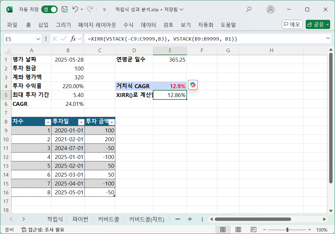 - (현재 글) 구글 시트와 마이크로소프트 엑셀에서 XIRR() 함수로 투자 기록에서 거치식 CAGR 구하기 [데이터 분석 부록 C3]