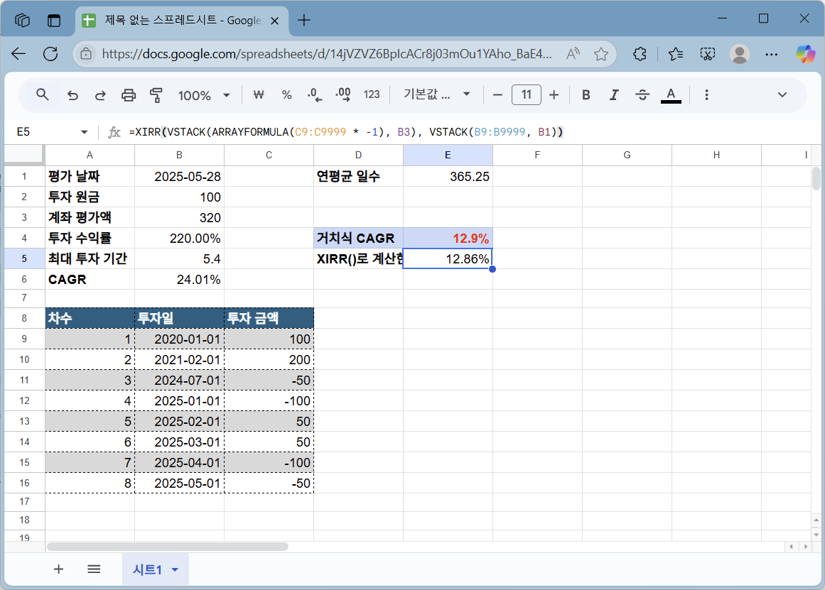 구글 시트에서 Goal Seek나 마이크로소프트 엑셀에서 목표값 찾기 기능을 사용하지 않고, XIRR() 함수를 이용하여 적립식/인출식/혼합식 투자 기록으로 거치식 수익률을 계산하는 방법을 살펴보았습니다.