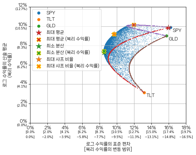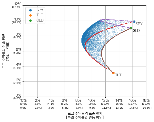x와 y축의 기본 눈금은 로그 수익률입니다. 괄호 안에 든 작은 수치는 해당 로그 수익률에 대응하는 복리 수익률입니다. 로그 수익률과 복리 수익률의 관계는 [중급 39] 복리 수익률로 보는 평균-분산 그래프의 해석 (표준 편차에 대한 비대칭 해석)를 참고하기 바랍니다.
