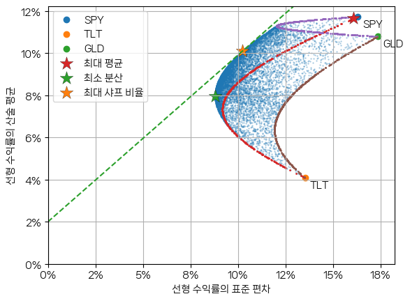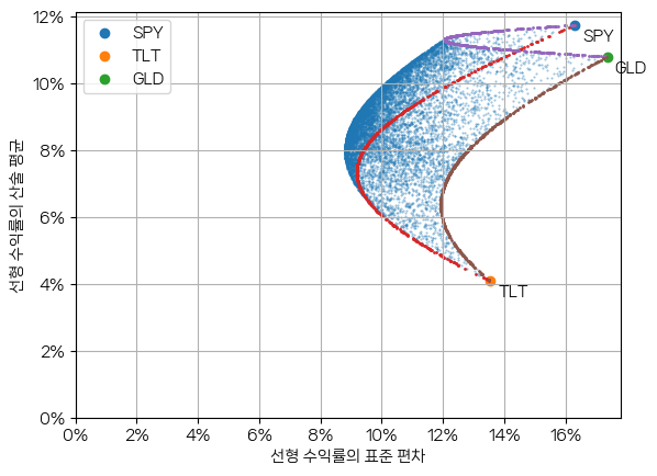 포트폴리오의 선형 수익률은 세 자산 각각의 평균 수익률의 투자 비중에 따른 가중 평균이기에 모든 포트폴리오는 평균 수익률이 가장 높았던 SPY와 가장 낮았던 TLT 사이에 위치하게 됩니다. 이에 비해 표준 편차는 자산 간의 관계에 따라 개별 자산의 표준 편차보다 줄어들 수 있습니다.
