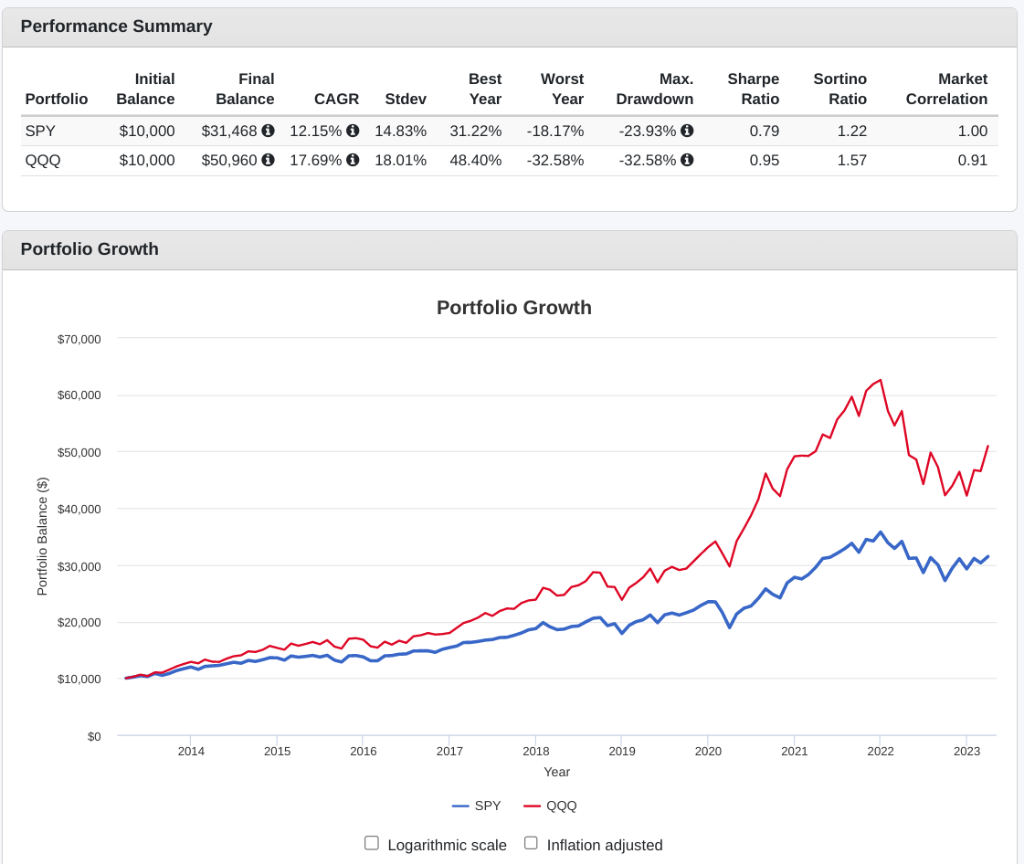 우리가 알고 있는 미국 증시의 고성장은 10년 전인 2013년부터라는 뜻입니다. (엄밀하게는 그 이전 저점인 2009년 2월부터라고 볼 수도 있습니다) 아래는 최근 10년간의 SPY와 QQQ의 성과입니다. 10년 동안 명목 금액 기준으로 SPY는 약 3.1배가 되고, QQQ는 약 5.1배가 되었습니다. 인플레이션을 고려하더라도 각각 2.4배와 3.9배가 되었으니 대단한 성과였다 할 수 있습니다.