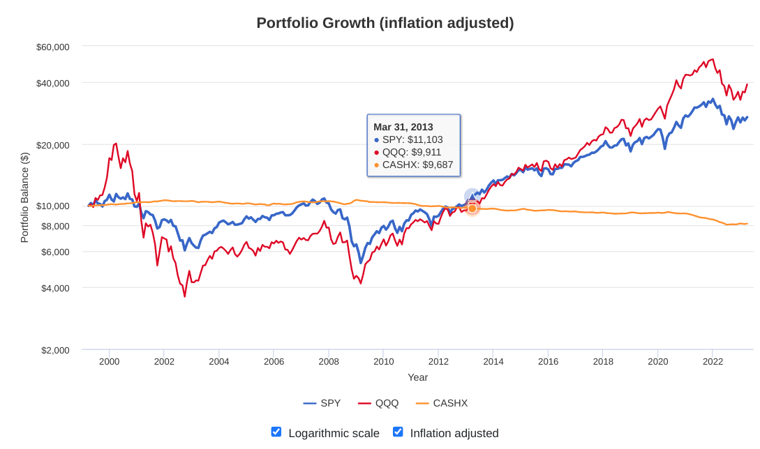 최근 10년간의 SPY와 QQQ의 CAGR이 각각 12.15%와 17.69% 임을 감안하면, 이 보다 더 긴 기간에 대한 6.87%와 8.53% 성과는 초라해 보입니다. 그래프를 자세히 보면 2010년대 초반까지 두 지수 모두 제자리걸음이었음을 알 수 있습니다. 말이 제자리걸음이지 인플레이션을 고려하면 배당 재투자를 했더라도 손실이 발생했던 기간입니다.