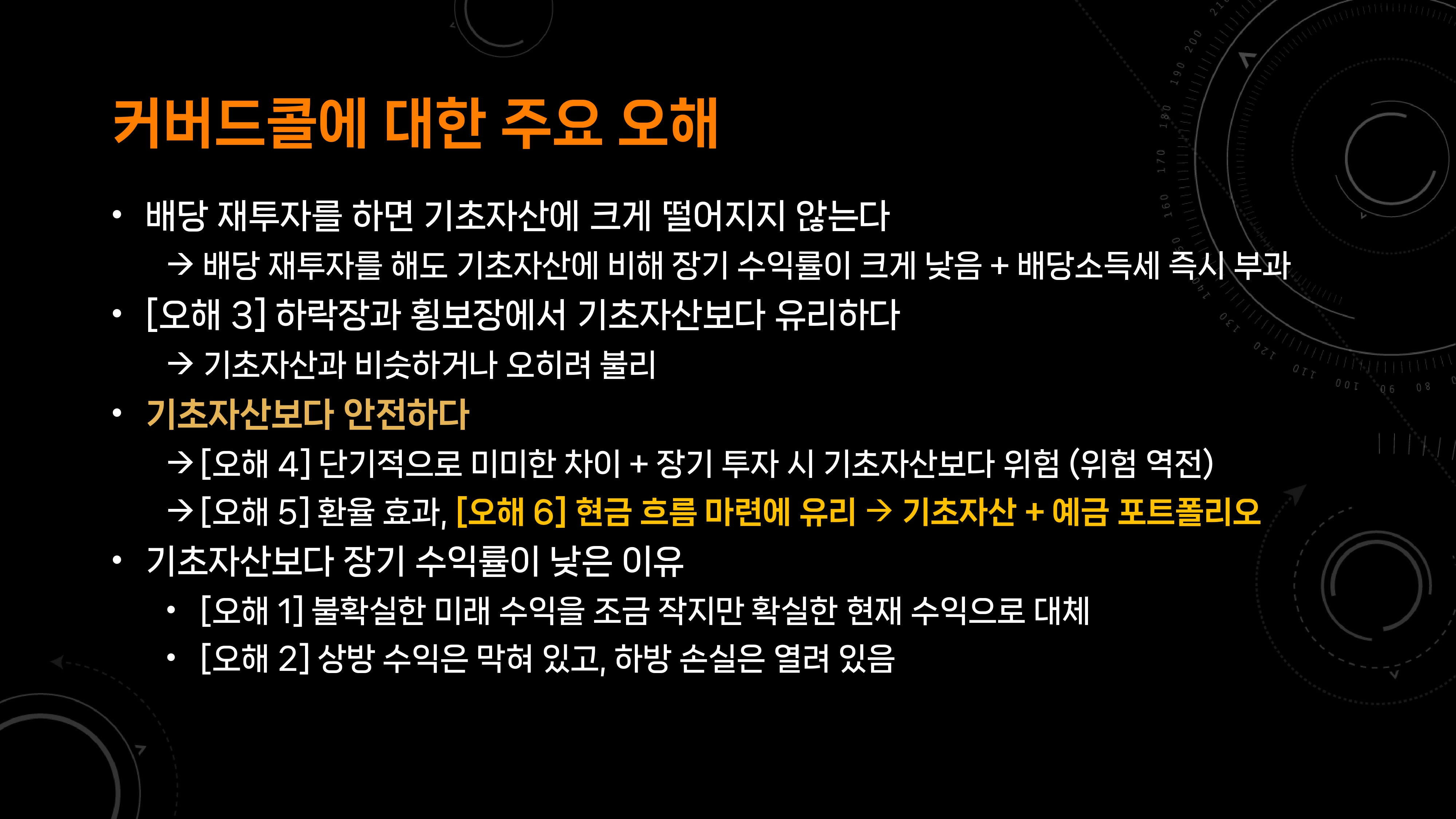 커버드콜에 대한 오해를 살펴보는 6번째 영상으로 커버드콜의 장기 수익률이 기초자산보다 낮지만, 현금 흐름 마련에는 더 안정적이거나 유리하다는 착시에 대해 살펴봅니다. 다음은 커버드콜에 대한 주요 오해와 그 이유를 설명하는 동영상 링크입니다.