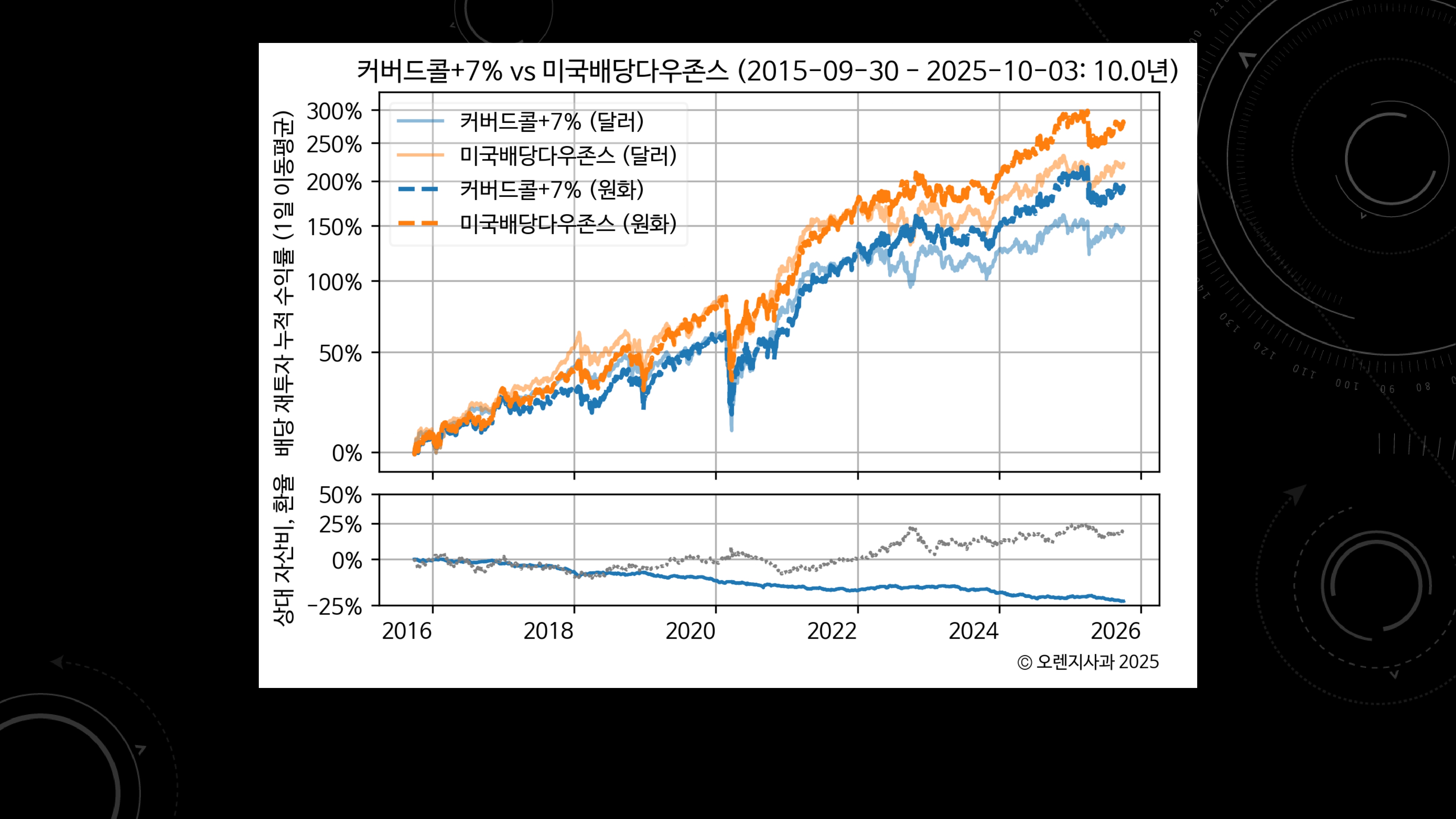 본 영상에서는 미국배당다우존스 지수와 이를 기초자산으로 7% 프리미엄을 목표로 월만기 콜옵션을 발행하는 커버드콜 지수를 대상으로 기초자산과 예금 포트폴리오 현금 흐름을 커버드콜과 비교해 봅니다. 각각 SCHD 및 ACE/SOL/TIGER/KODEX 미국배당다우존스와 TIGER 미국배당다우존스타겟커버드콜2호의 기초지수입니다.