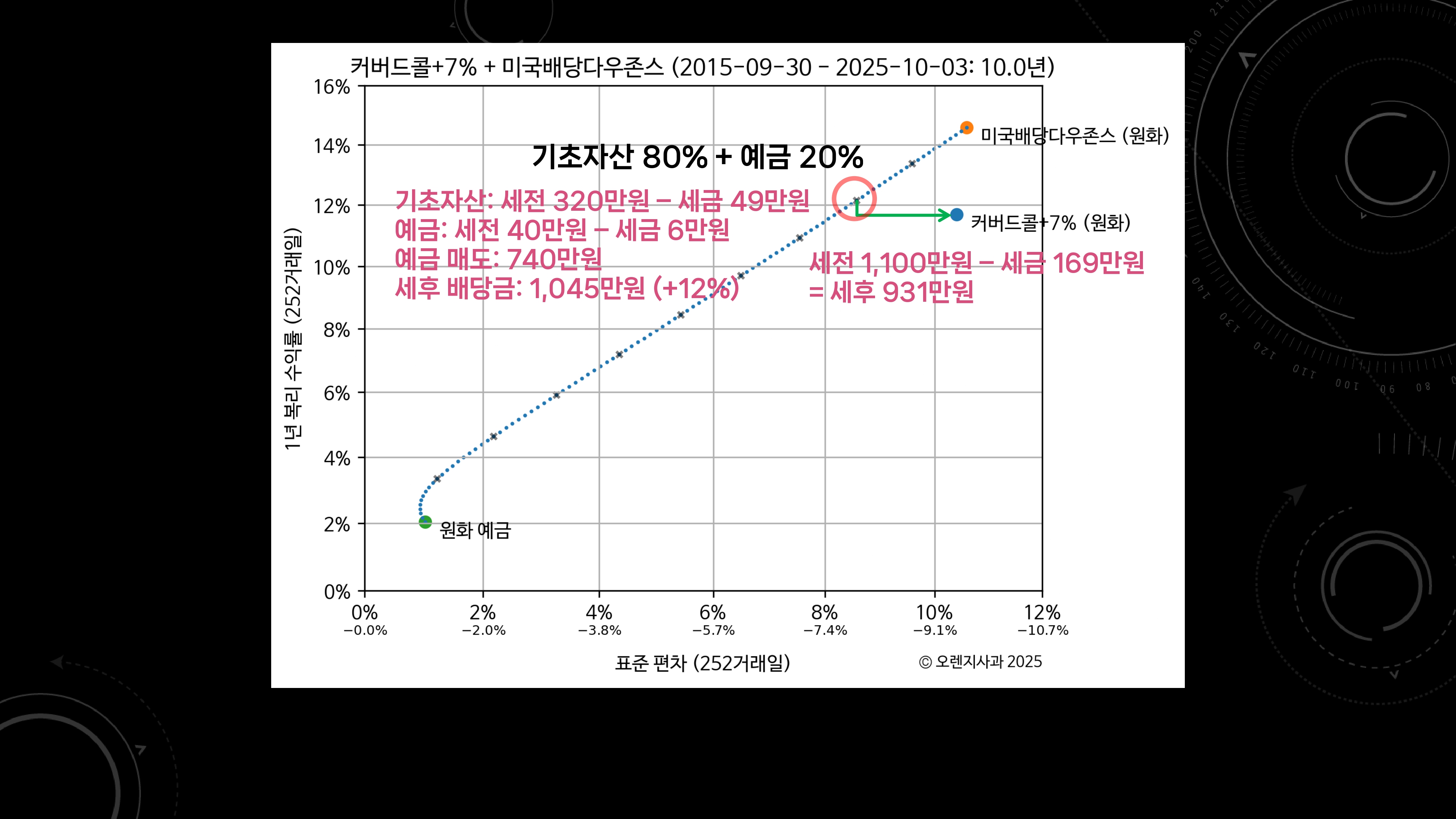 이렇게 구성한 기초자산(주식형 ETF)과 예금 혼합 포트폴리오 역시 자산으로 간주할 수 있기에 다른 자산과 동일한 방식으로 비교할 수 있습니다. 기초자산과 예금 혼합 포트폴리오를 커버드콜과 비교하면, 대개의 커버드콜은 동일한 수준의 수익률을 가진 기초자산 + 예금 포트폴리오보다 더 위험합니다. 다르게 말하면 기초자산 + 예금 포트폴리오는 같은 수준의 현금 흐름을 커버드콜보다 더 안정적으로 만들 수 있다는 이야기가 됩니다.