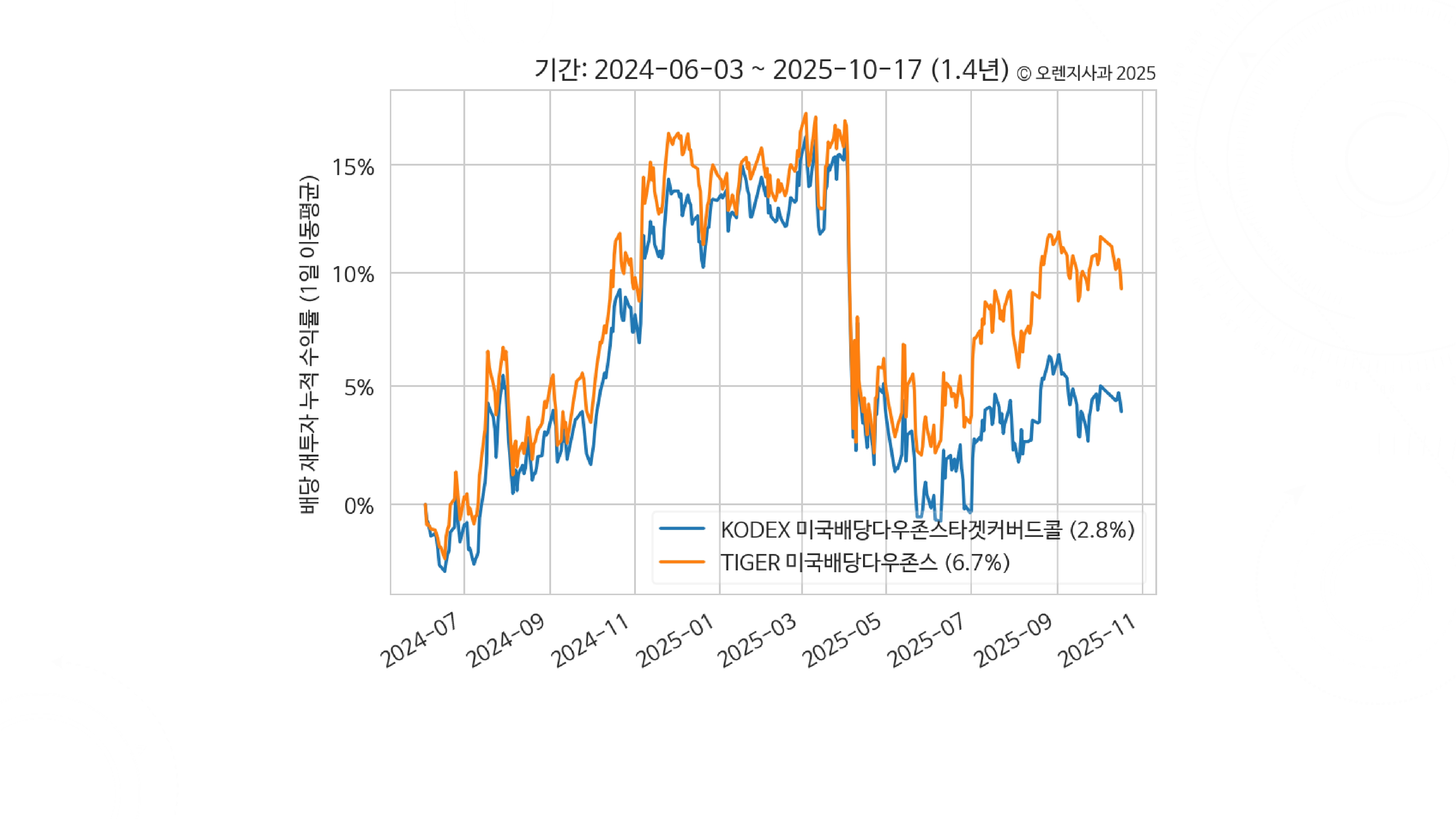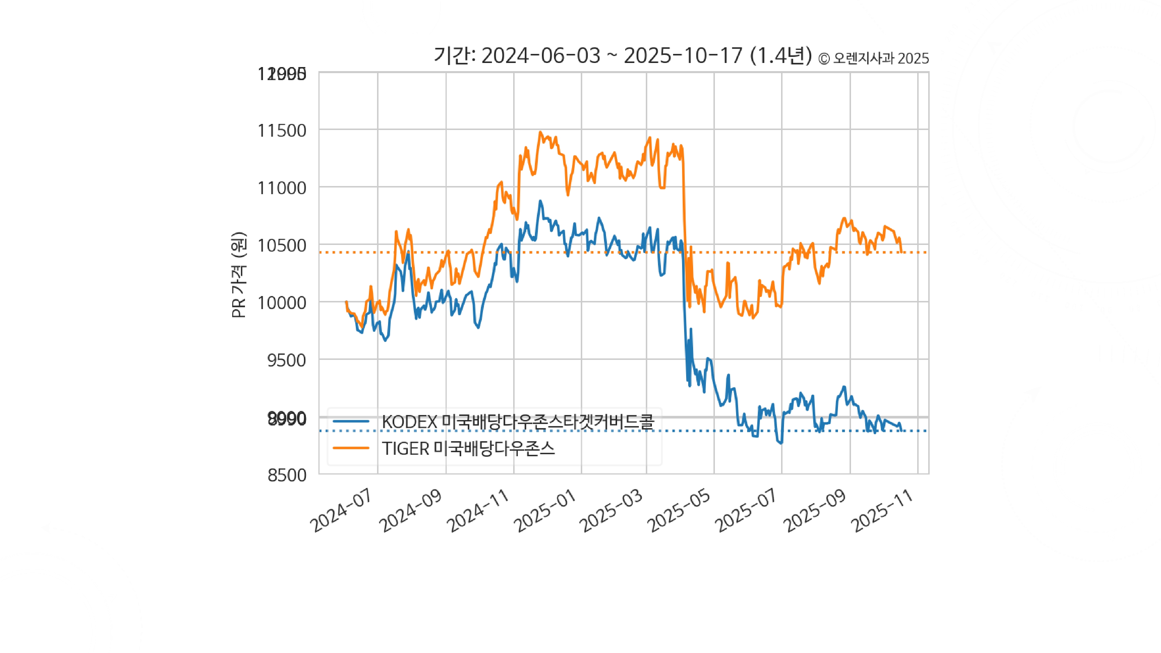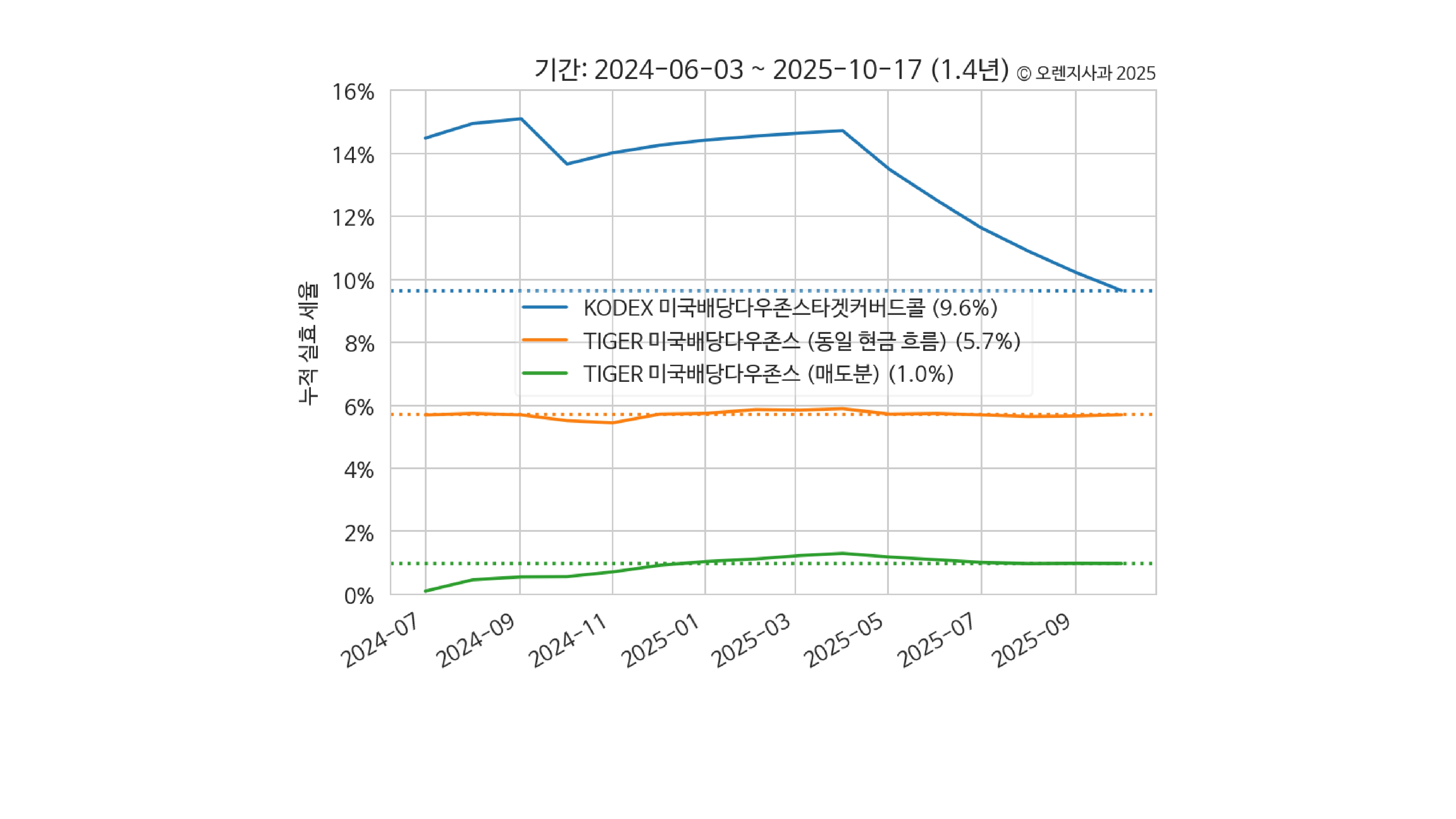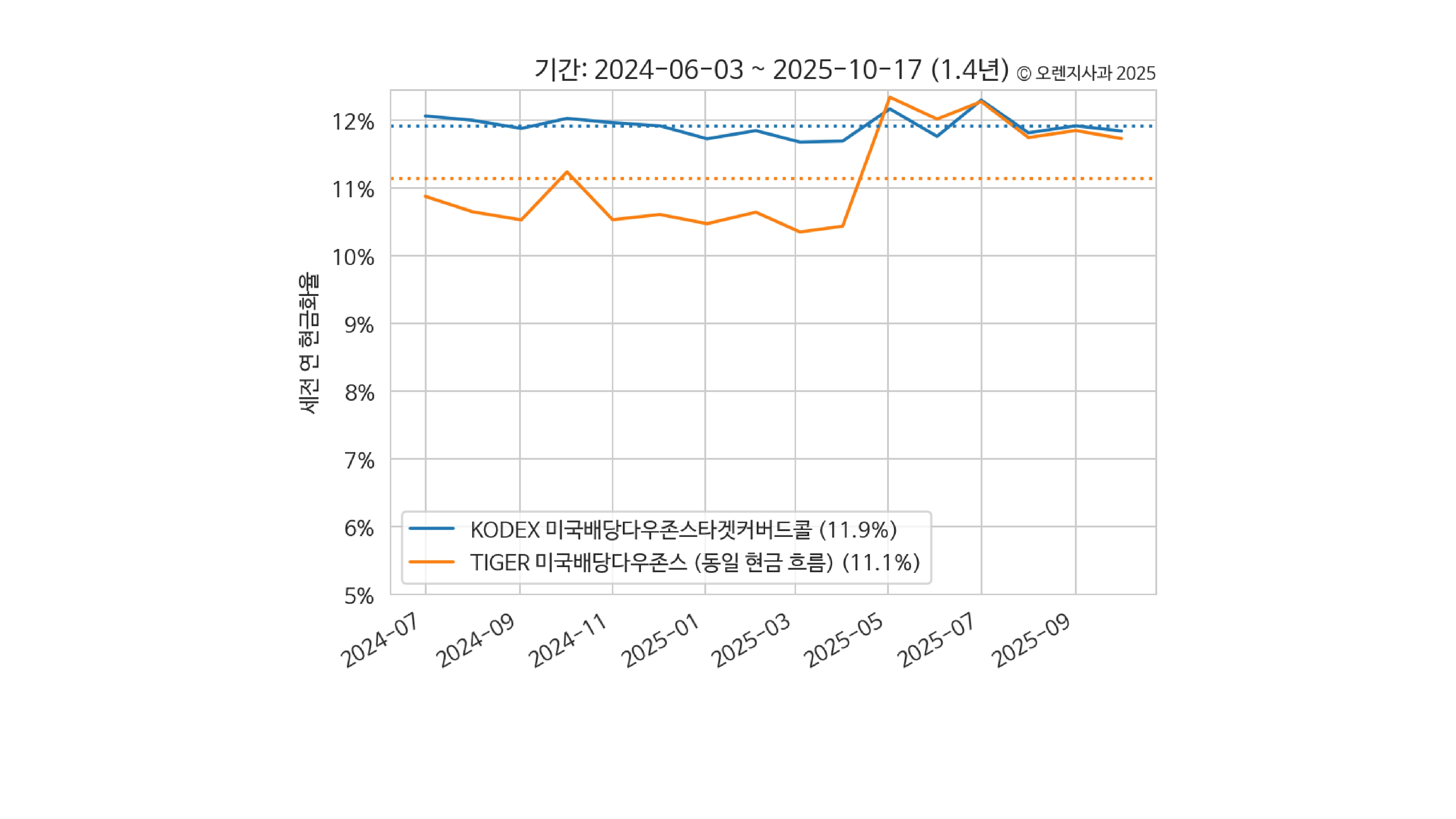 참고로 KODEX 미국배당다우존스타겟커버드콜는 TIGER 미국배당다우존스타겟커버드콜1호와 2호보다 조금 더 목표 분배율이 높은 상품이며, 콜옵션 발행 비중을 제외한 나머지 구조가 동일하기에, 수익률 특성 또한 같은 경향을 띕니다.