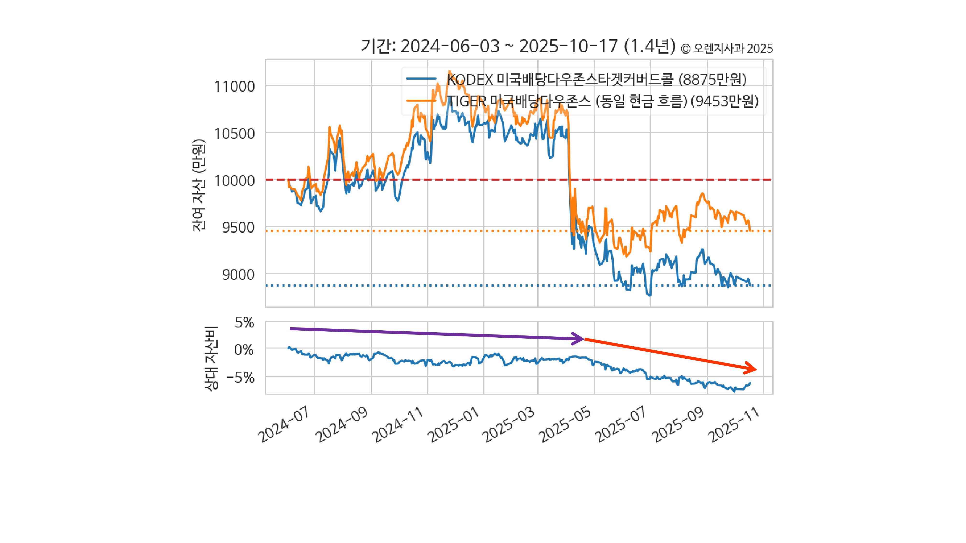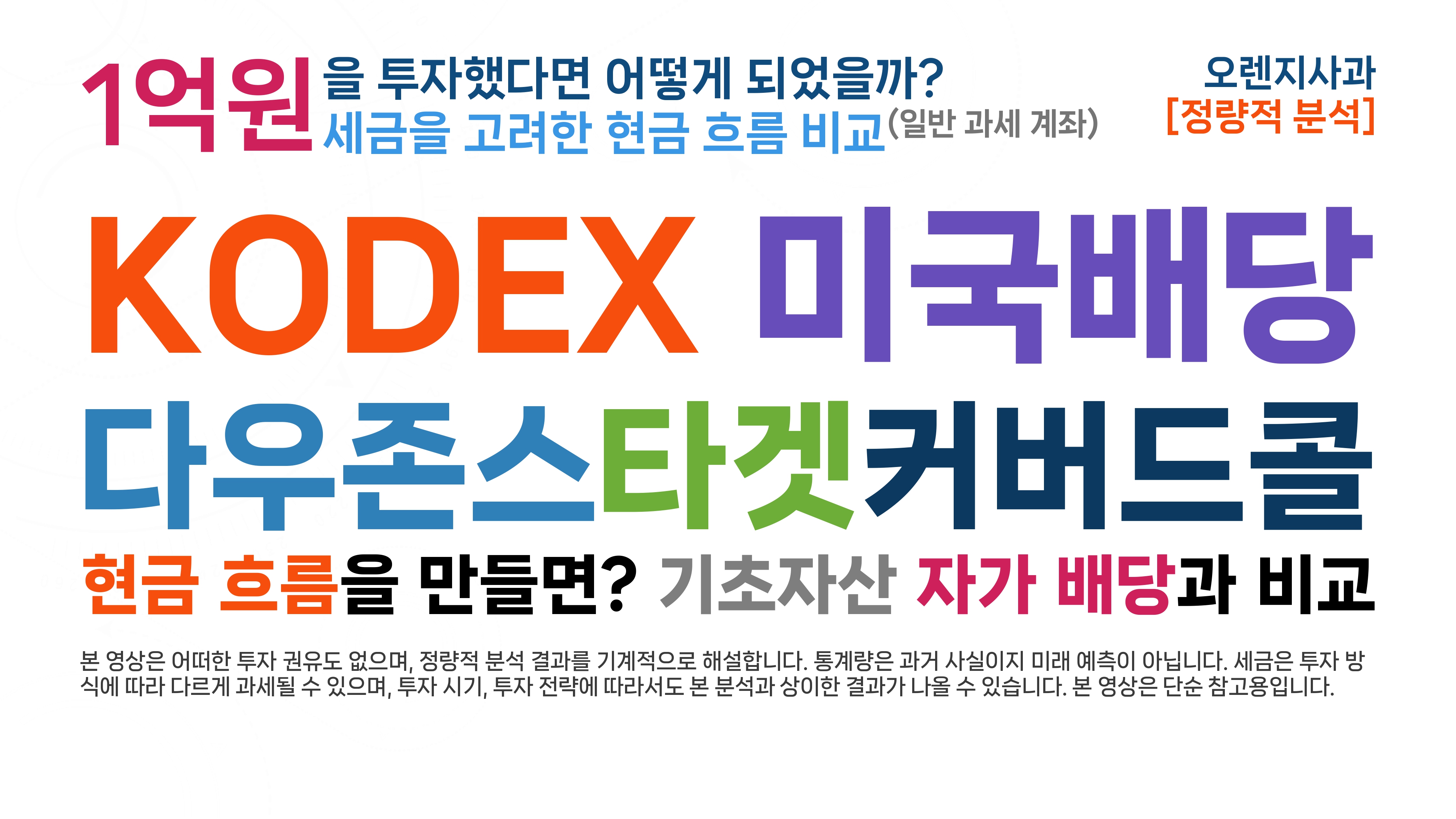 삼성자산운용의 미국배당다우존스를 기초자산으로 콜옵션을 발행하여 10% 추가 분배율을 목표로 하는 KODEX 미국배당다우존스타겟커버드콜 ETF로 만드는 현금 흐름을 기초자산인 TIGER 미국배당다우존스 ETF와 비교해 봅니다. 1억원을 투자하고 동일한 세후 현금 흐름을 만들었을 때, 커버드콜이 얼마나 안정적이었는지, 잔여 자산은 얼마나 남았는지 비교해 봅니다.