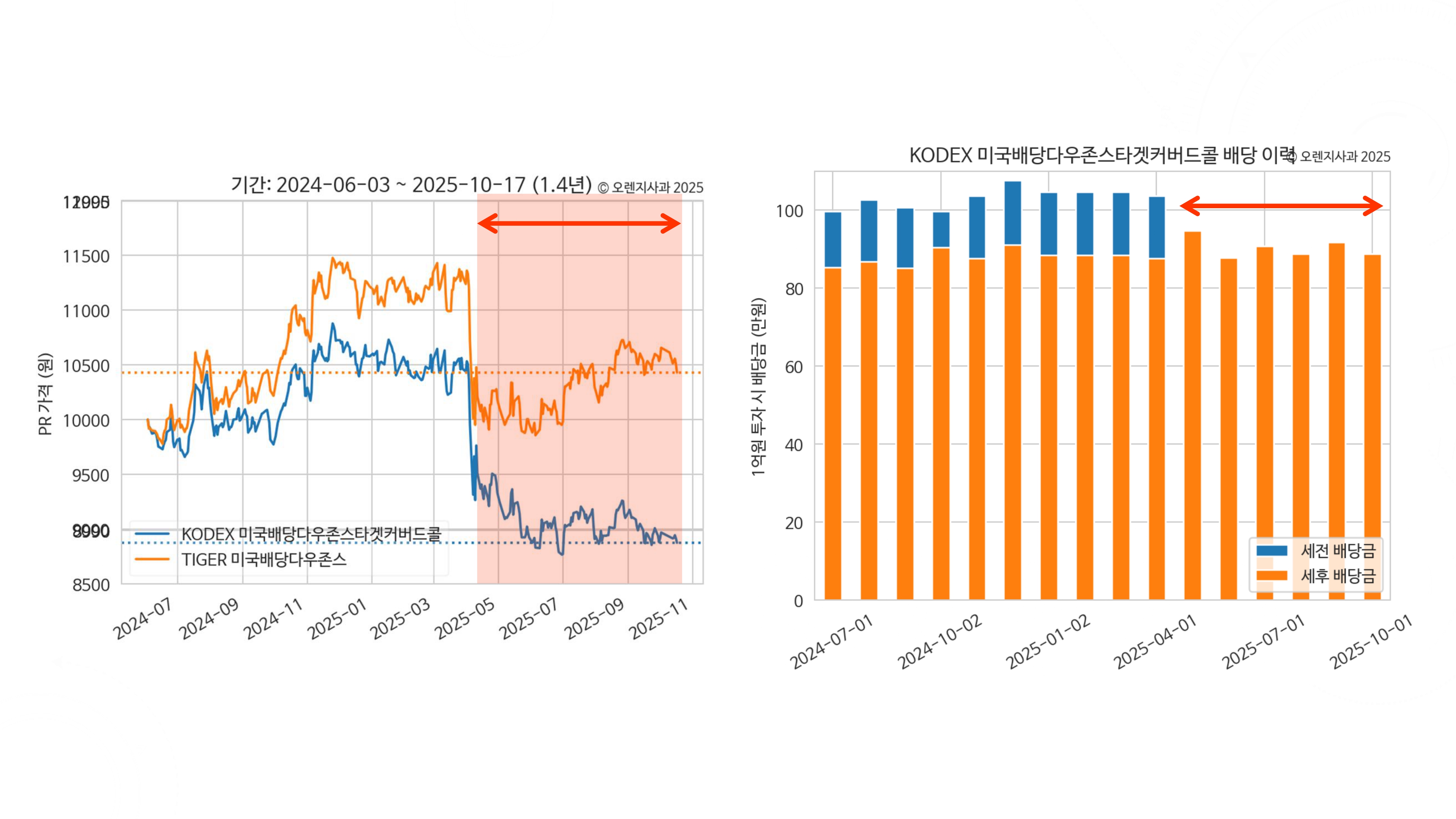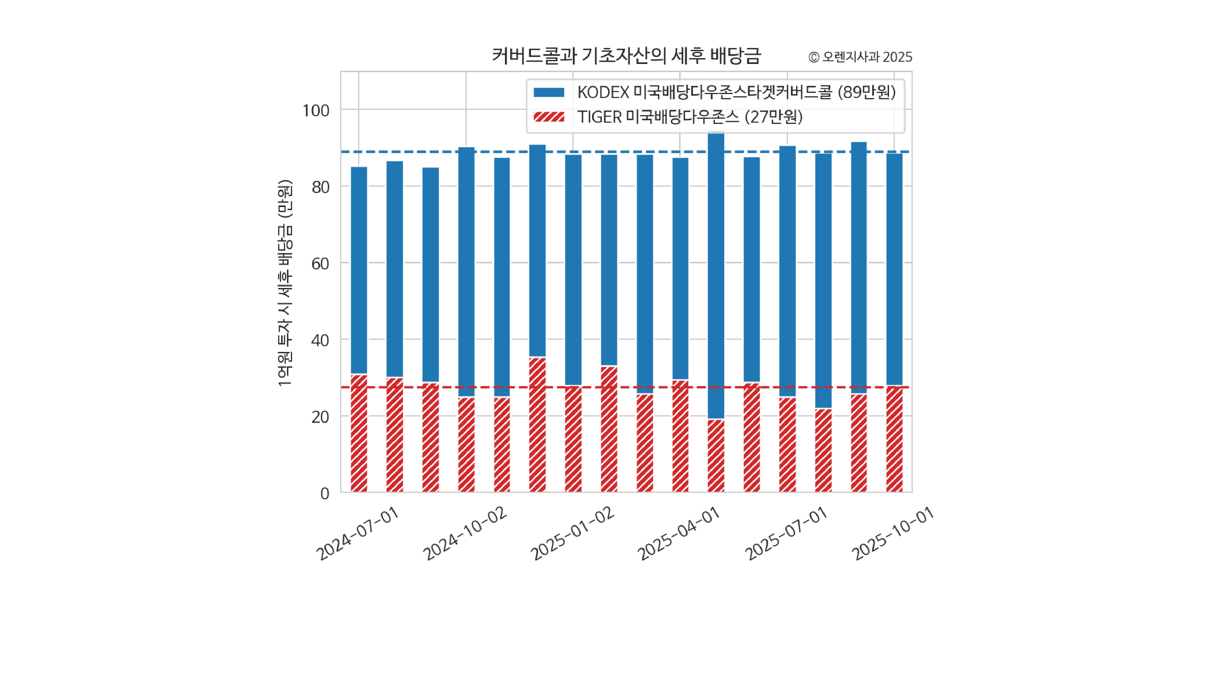- [현금 흐름 1] TIGER 미국배당다우존스타겟커버드콜2호 (1억원으로 현금 흐름을 만든다면, vs TIGER 미국배당다우존스, 세금 고려)