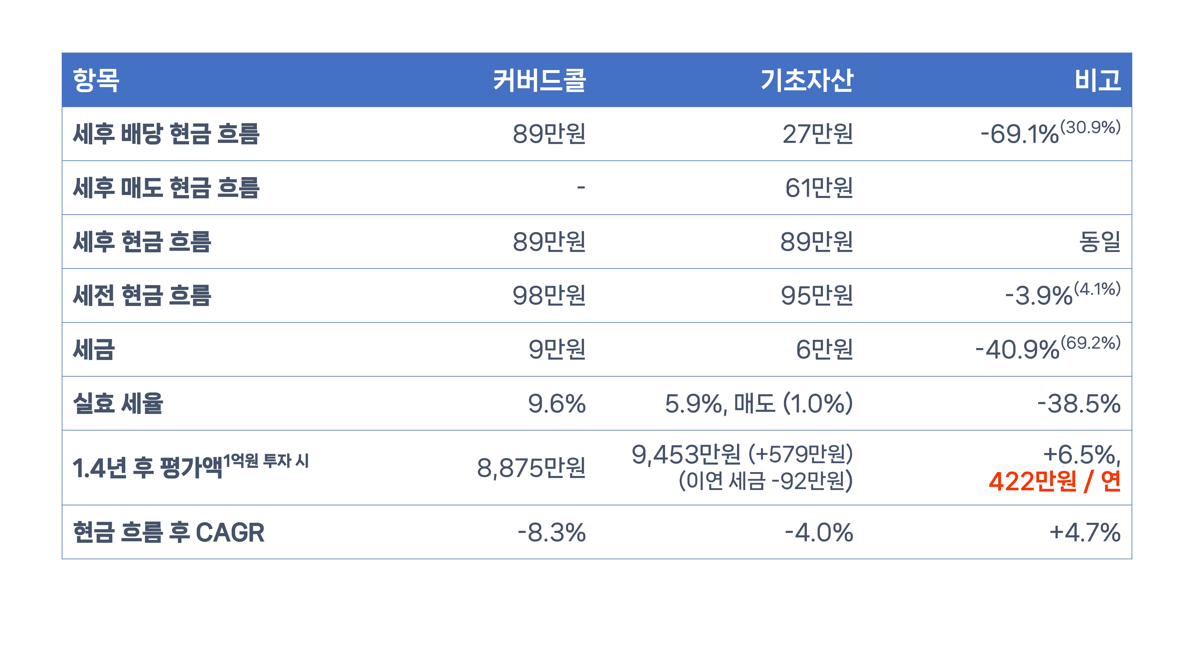 또한 일반 과세 계좌를 기준으로 동일한 세후 현금 흐름을 만들기 위해 적용될 실효 세율은 얼마였고, 커버드콜이 하락장과 횡보장에 유리하다는 생각이 현실적으로 착시였음도 확인합니다.