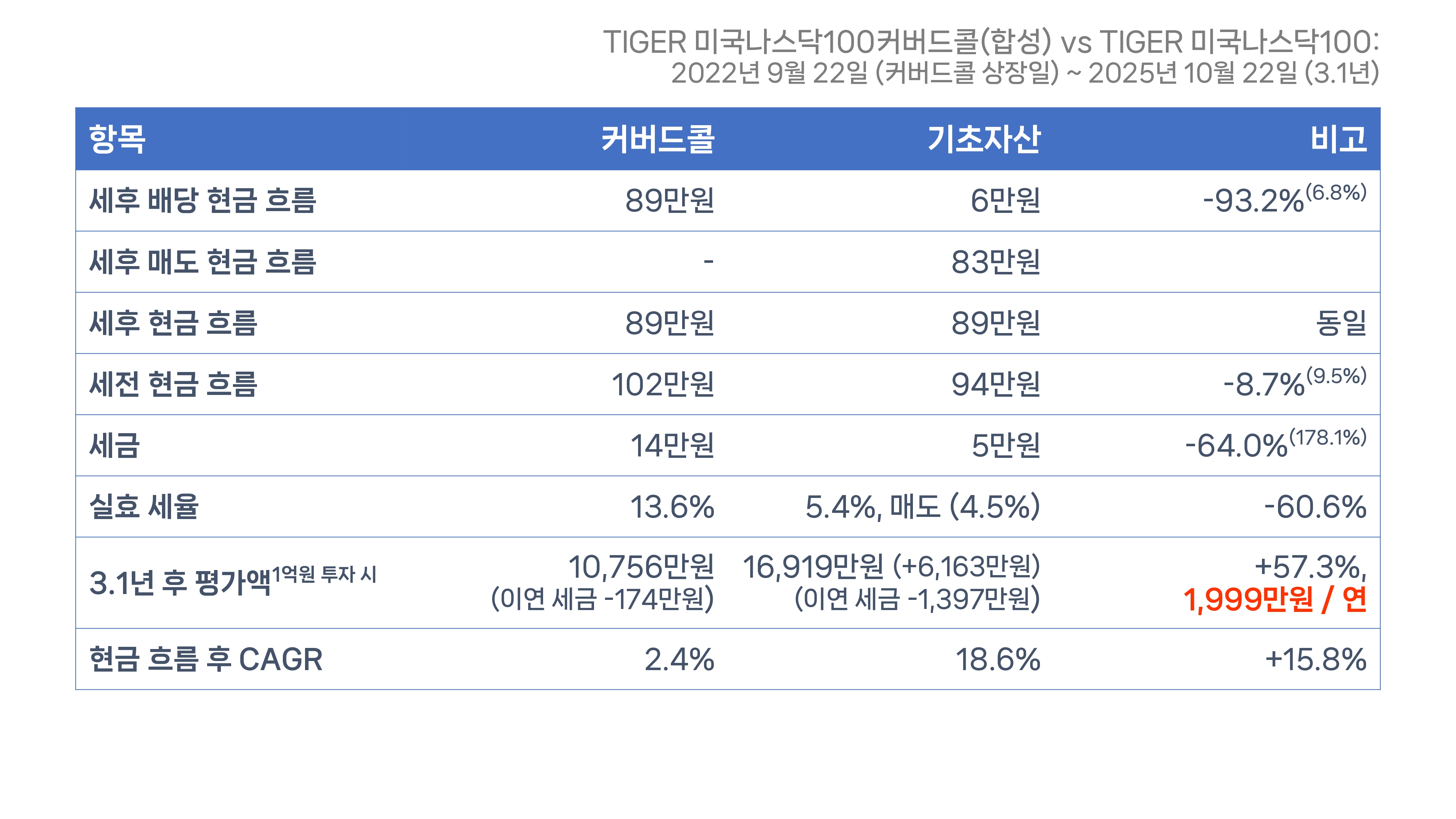 이 커버드콜에 투자하고 배당금으로 현금 흐름을 만들었을 때 얼마나 효율적이었는지 기초자산과 비교해 봅니다. 두 상품의 동일 상장 기간에 대해 1억원을 투자했을 때, 일반 과세 계좌를 기준으로 동일한 세후 현금 흐름을 만들기 위해 실효 세율이 얼마나 부과되었고, 잔여 자산은 얼마나 남았는지도 함께 살펴봅니다.