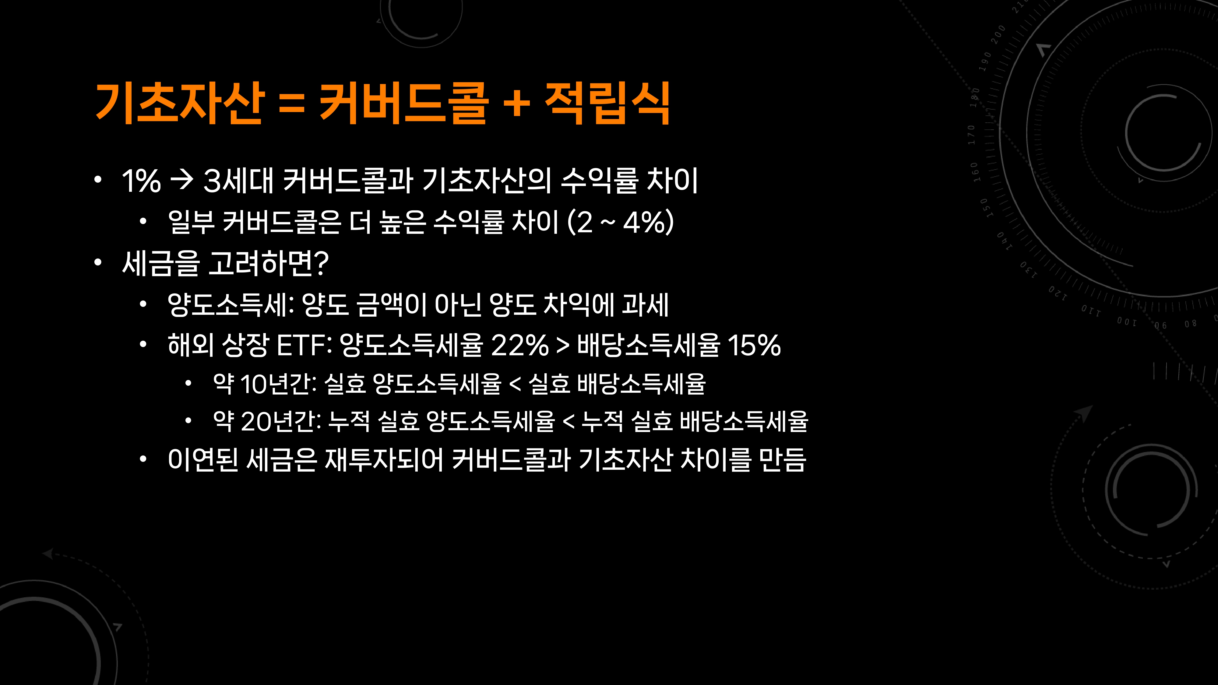 다르게 말하면 똑같이 S&P 500 지수를 추종하는데, 기초자산은 연 0.1% 수수료를, 커버드콜은 연 1.1% 수수료를 부과하는 ETF라 보면 크게 틀리지 않습니다. 여기에 세금을 내야 하는 일반 과세 계좌라면, 매도에 부과되는 세금의 과세 이연 효과에 의해 그 차이는 2% 수준으로 높아집니다.