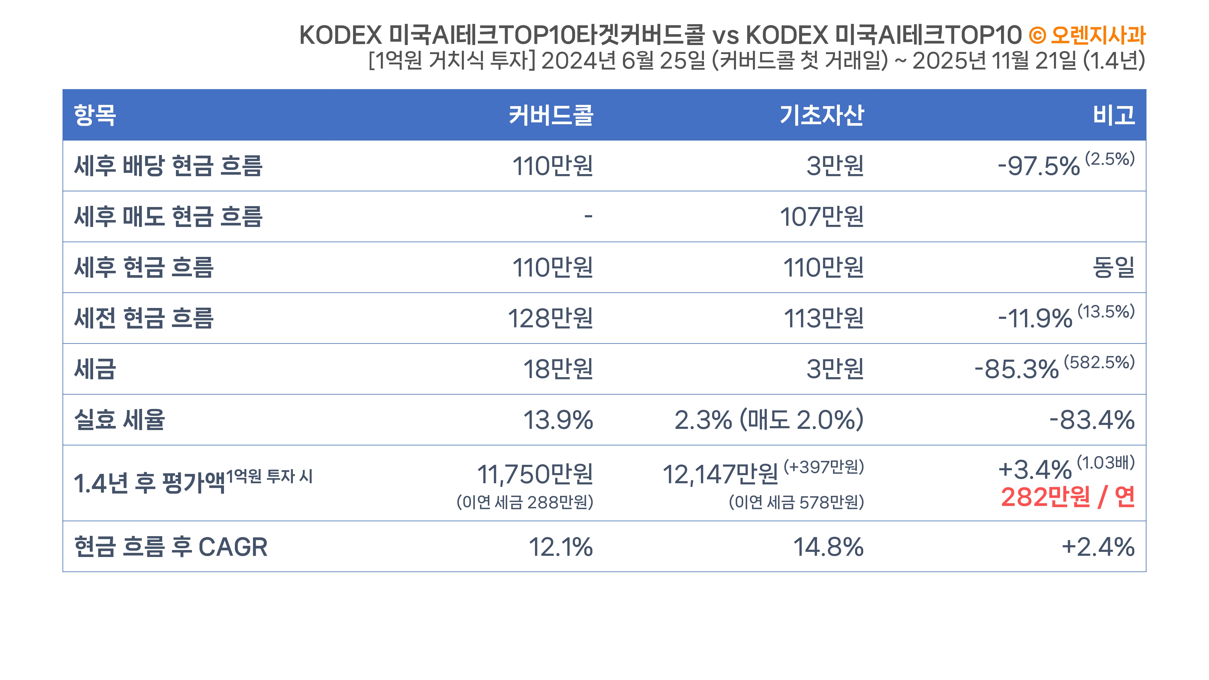 KODEX 미국AI테크TOP10타겟커버드콜이 현금 흐름 생성에 얼마나 효율적이었는지 살펴보고, KODEX 미국AI테크TOP10 대비 잔여 자산 규모도 비교해 봅니다. 두 상품의 동일 상장 기간에 대해 1억원을 투자했을 때, 일반 과세 계좌를 기준으로 실효 세율이 얼마나 부과되었는지도 함께 살펴봅니다.