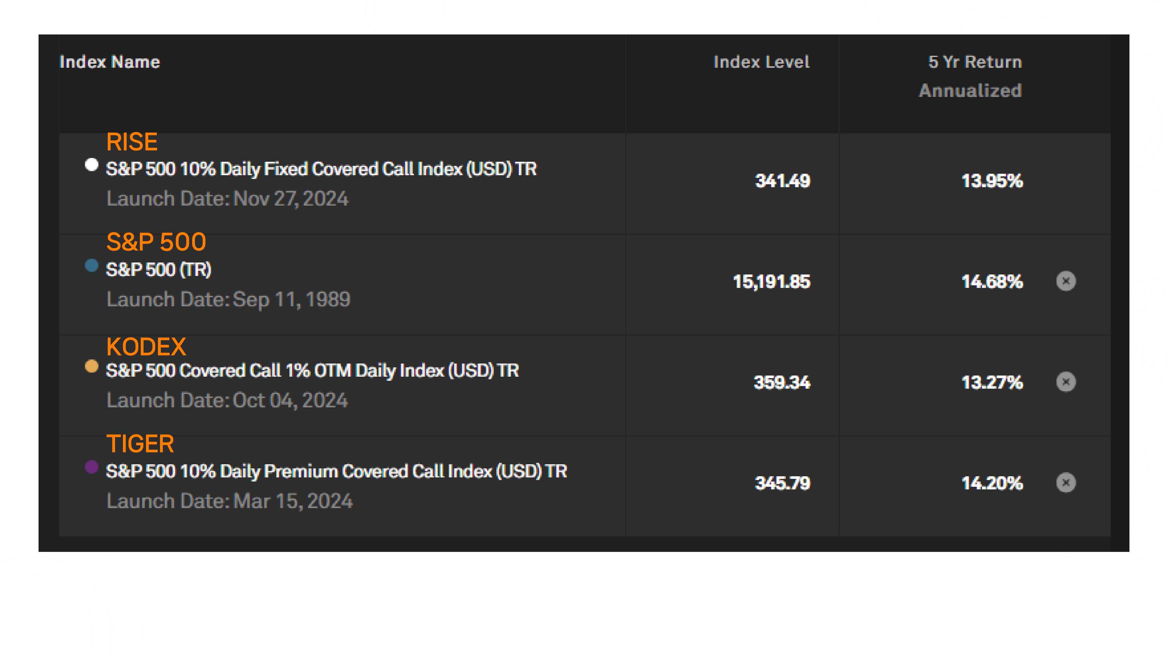 - 커버드콜: S&P 500 10% Daily Fixed Covered Call Index (TR)